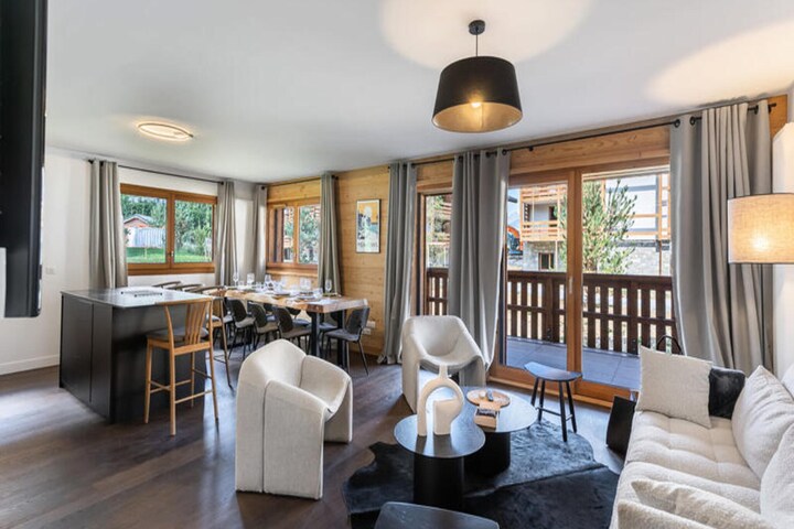 This newly built 100m² apartment in the Villaret area of Megève offers a spacious and welcoming retreat, perfect for families or small groups. Located just a 15-minute walk from the village center, it boasts a bright, open layout with a well-equipped kitchen and a comfortable living area. The apartment features two double bedrooms, including a master with an en-suite shower room, and a child’s bedroom with three single beds. The apartment also has a separate bathroom with two sinks and independent toilets. A balcony provides a great space to enjoy the surrounding alpine beauty.
