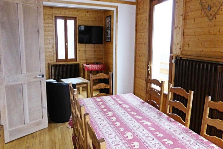 This spacious chalet offers a perfect getaway for families or friends, accommodating up to 10 people. The property features four bedrooms, including two with double beds and two with single beds. The living room includes a sofa bed for two, providing additional sleeping space. The chalet is pet-friendly upon request, allowing you to bring your furry friends along. The cozy atmosphere, combined with stunning views of the Mont-Blanc range, creates an ideal environment for a relaxing stay.