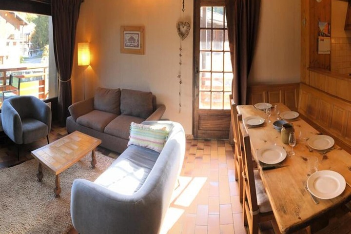 This spacious 65 m² apartment, located on the second floor of a building, offers a comfortable retreat for up to six guests. The apartment features a bedroom with a double bed, two twin bedrooms (one with a sofa bed and the other with bunk beds), and a cozy living room with a dining area and television. Enjoy the stunning views of the Mont-Blanc range from the balcony. The property is pet-friendly, allowing you to bring your furry companions along for your stay. Please note that snow tires or chains are mandatory in winter months for access.