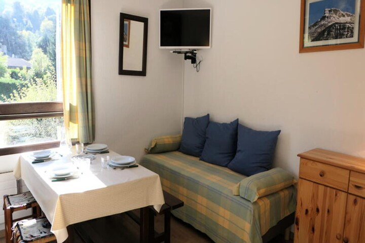 Located near the heart of Saint-Gervais, this charming ground-floor studio is perfect for a family or group of up to four. The studio offers a cozy living area with a double sofa bed (160x200), a TV, and a dining space, while a separate sleeping nook features bunk beds (90x190), ideal for kids or friends. Its South-East-facing balcony invites you to relax and enjoy the fresh mountain air. Pets are welcome, making it a great choice for pet owners looking to explore the area.