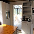 The chalet is fully equipped with a large kitchen featuring two refrigerators, two ovens, a microwave, and a dishwasher. Additional amenities include a sauna and spa for relaxation, a heated ski room, and a laundry room with a washing machine and dryer. There is also a spacious dining area with a bar and a south-facing veranda offering beautiful views of Mont-Joly.
