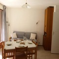 This 27 m² 2-room apartment, located on the 1st floor, accommodates up to 4 people. It features a living room with a pull-out sofa (two single beds) and a television, perfect for relaxing after a day of outdoor activities. The bedroom contains two single beds, and the bathroom is equipped with a bathtub, while the WC is independent. The apartment has an East-facing balcony with mountain views. Please note, pets are not allowed, and the building does not have an elevator.