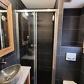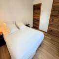 Inside, the apartment is thoughtfully designed to accommodate up to six guests, including two children. The bright and airy living area features a cozy lounge, a dining space, and a fully equipped open-plan kitchen, all leading to the large north-east-facing terrace. The sleeping arrangements include an en-suite master bedroom with a double bed, a second bedroom with two single beds that can be joined, and a charming cabin area with bunk beds for children. Modern amenities such as Wi-Fi, a Nespresso coffee maker, and a raclette grill ensure a comfortable and enjoyable stay.