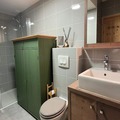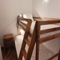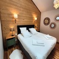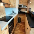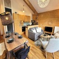Step inside to discover a thoughtfully designed space that combines rustic charm with modern comfort. The open-plan living area features high ceilings, a fully equipped kitchen, and a dining space that flows seamlessly into the lounge, which opens onto a private balcony. The master bedroom boasts a plush double bed and a spacious walk-in closet, while the cabin-style sleeping area with bunk beds offers a fun and practical solution for children or additional guests. The bathroom is well-appointed with a heated towel rail and contemporary fixtures, ensuring a relaxing experience after a day on the slopes.