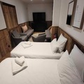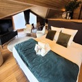 Spanning four levels, the chalet accommodates 12 to 14 guests in utmost comfort. The first level features three beautifully designed bedrooms, including a bunk room perfect for children, all with en-suite facilities and access to a sun-drenched terrace. The second level boasts a grand living area with a fully equipped kitchen, opening onto two south-facing terraces. Here, you’ll find an outdoor dining space and a private jacuzzi to unwind after a day on the slopes. The top floor houses a stunning master suite with cathedral windows offering sweeping views, while the lower level includes a cozy cabin bedroom, a sauna with a shower, and a laundry area.
