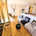 The apartment comfortably accommodates up to six guests, featuring two spacious bedrooms, including a luxurious master suite with an en-suite bathroom, and a versatile third sleeping area. The open-plan living room is thoughtfully designed, with a fully equipped kitchen, dining area, and a cozy lounge that opens onto a private terrace. Here, you can unwind with a cup of coffee while soaking in the crisp alpine air. Modern conveniences such as a washer-dryer, fiber optic Wi-Fi, and individual heat pump heating ensure a comfortable stay year-round. Additional amenities include underground parking and a private ski locker, making it an ideal base for winter sports enthusiasts.