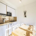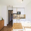 The residence features a cozy and well-designed layout, perfect for families or small groups. With a living room that includes a sofa bed, a comfortable armchair, and a dining area for five, you’ll feel right at home. The open kitchen is fully equipped for preparing delicious meals, while the private balcony offers a tranquil space to enjoy the crisp mountain air. The bedroom, complete with a double bed and bunk beds, ensures restful nights after a day of adventure. Modern amenities such as Wi-Fi (available for an additional fee) and pet-friendly options add to the convenience of your stay.