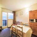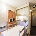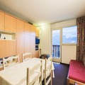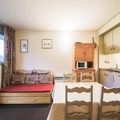 The apartment, located on the second floor, is thoughtfully designed to maximize its 26 m² space. It features a bright living room with a fold-down bed for two, a sleeping alcove with bunk beds, and a fully equipped kitchen open to the living area. The dining space, complete with a table and four chairs, invites you to share meals and moments together. After a day on the slopes, unwind in the bathroom with a relaxing bath or step out onto the balcony to soak in the peaceful surroundings.