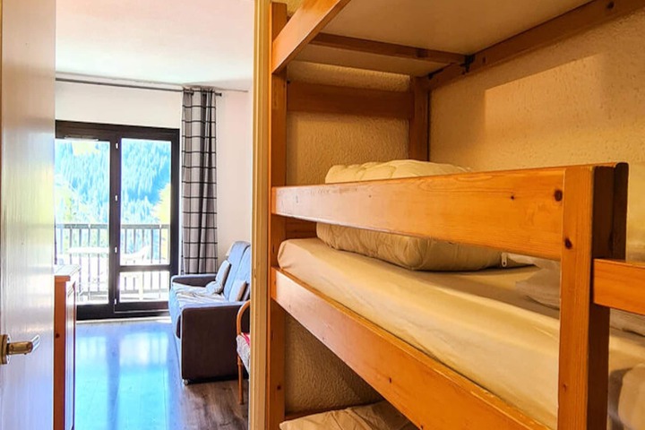 In the charming Flaine Forêt district, this cozy studio offers a delightful alpine retreat just 150 meters from the slopes and ski school meeting points. Surrounded by the serene beauty of the French Alps, it’s the perfect spot for adventurers and relaxation seekers alike. Imagine mornings filled with crisp mountain air as you step onto your south-facing balcony, soaking in the sunshine and preparing for a day of skiing or exploring the picturesque surroundings. Whether you’re here for winter sports or summer hikes, this residence places you at the heart of it all. \n\nDesigned for up to four guests, the studio features a smart layout with parquet and tiled floors that create a warm and inviting atmosphere. The entrance includes a set of bunk beds, while the living room offers a comfortable double sofa bed and a flat-screen TV for cozy evenings. The kitchenette is equipped with four electric hobs, a dishwasher, and a microwave, making it easy to prepare meals after a day of adventure. A modern shower room with a heated towel rail ensures comfort and convenience, while the ski locker provides practical storage for your gear. \n\nLocated close to shops and essential facilities, everything you need is within easy reach. In summer, guests staying six nights or more can enjoy the Flaine Summer Pass, granting access to a variety of exciting activities. From scenic trails to cultural events, Flaine transforms into a vibrant hub of outdoor fun. \n\nWhether you’re carving through powdery slopes in winter or basking in the alpine sun during summer, this studio offers a welcoming base for unforgettable memories in the heart of the mountains.