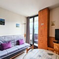 The studio is thoughtfully designed to maximize comfort and functionality. The living area features a double sofa bed, while the cabin nook includes a set of bunk beds, perfect for families or small groups. A south-facing balcony invites you to soak in the mountain views and fresh alpine air. The kitchenette is equipped with two electric hobs, a multifunction oven, and a dishwasher, making meal preparation a breeze. Modern comforts such as a flat-screen TV and a bathroom with a bathtub ensure a relaxing stay. Please note that the top bunk is not suitable for children under six years old, and bed linen and towels are not provided.