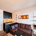 The 27 m² south-facing studio is thoughtfully designed to accommodate up to four guests. The entrance features a set of bunk beds, while the living room includes a comfortable double sofa bed, making it ideal for families or small groups. The open-plan kitchen is equipped with modern amenities, including ceramic hobs, an oven, a dishwasher, and a microwave, ensuring you have everything you need to prepare meals after a day of exploration. Relax on the private south-facing balcony, soak in the sunshine, and breathe in the crisp mountain air. Additional features include a flat-screen TV, DVD player, a bathroom with a bathtub, and a separate toilet. For your convenience, sheets, towels, and a welcome kit are included, and a ski locker is available for your gear.