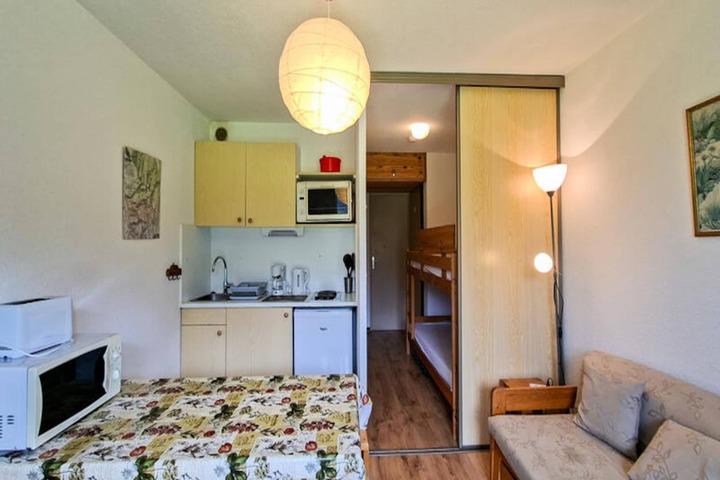 High in the serene French Alps, this charming studio cabin in Flaine Forêt offers a delightful retreat for adventurers and nature lovers alike. With its south-facing balcony overlooking the pristine mountain scenery, you’ll wake up to the crisp alpine air and the promise of thrilling days ahead. The residence is conveniently located just 250 meters from the slopes and ski school meeting points, making it an ideal base for winter sports enthusiasts. Shops and a bus stop are also within easy reach, ensuring everything you need is close at hand. \n\nDesigned to accommodate up to four guests, the studio features a cozy layout with a double bed in the cabin and bunk beds in the entrance area. The kitchenette is equipped with two electric hotplates, a microwave, and an oven, allowing you to prepare hearty meals after a day of skiing or hiking. Additional amenities include a flat-screen TV, a bathroom with a bathtub, and a separate toilet for added convenience. The south-facing balcony is the perfect spot to unwind and soak in the tranquil mountain views. Please note that the upper bunk is not suitable for children under six years old, and bed linen and towels are not provided. \n\nIn the summer, guests staying for six nights or more can enjoy the Flaine Summer Pass, which includes access to a variety of activities such as hiking, mountain biking, and cultural events. The area transforms into a vibrant hub of outdoor adventure, with trails that lead to breathtaking vistas and opportunities to explore the natural beauty of the Alps. \n\nWhether you’re seeking the thrill of the slopes or the serenity of alpine summers, this studio cabin in Flaine Forêt offers a cozy and convenient base for creating unforgettable memories in the heart of the French Alps.