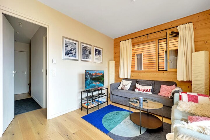 High above the shimmering valley, where alpine serenity meets modern luxury, this exquisite apartment in Le Grand Cerf residence offers an unparalleled mountain retreat. With direct access to the Timalets ski slope and gondola lift, your adventure begins just outside the door. Wake up to breathtaking views from the expansive balcony, where the crisp mountain air and stunning vistas set the tone for an unforgettable day in the French Alps. This is a place where comfort and elegance blend seamlessly with the thrill of outdoor exploration. \n\nInside, the 75 m² apartment is tastefully designed to accommodate up to six guests. The master bedroom features a plush 160cm bed and a private en-suite bathroom, ensuring a tranquil retreat after a day on the slopes. A second bedroom with two 90cm beds and a cozy cabin with bunk beds share a modern shower room and separate WC. The spacious living and dining area, bathed in natural light, invites you to relax and unwind, while the fully equipped kitchen—with induction hob, dishwasher, washer-dryer, and large refrigerator—makes meal preparation effortless. Two ski lockers and underground parking spaces add to the convenience of this high-end rental. \n\nThe location is unbeatable. Whether you’re here for winter skiing or summer hiking, the gondola lift provides easy access to the surrounding wonders. Nearby, you’ll find charming alpine villages, local markets, and trails that wind through breathtaking landscapes. For those seeking relaxation, the residence itself offers a peaceful haven with all the comforts of home. \n\nChoose this exceptional property for a holiday that combines the best of alpine adventure and refined living. With beds made upon arrival and bath towels provided, every detail has been thoughtfully prepared to ensure your stay is as effortless as it is memorable.