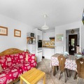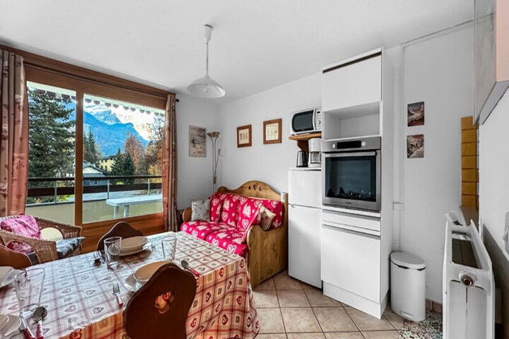 Awaken to the serene beauty of the French Alps in this charming apartment nestled within the Pré du Bois district of Les Carroz. With its inviting ambiance and thoughtful design, this residence promises a memorable getaway for families and friends alike. Imagine sipping your morning coffee on one of the two spacious southeast-facing balconies, soaking in panoramic views of the Carroz slopes as the sun rises over the mountains. Just 900 meters from the village center, this apartment offers both tranquility and convenience, making it an ideal retreat for your alpine adventure. \n\nDesigned to comfortably accommodate up to six guests, the apartment features three distinct sleeping areas: a cozy bedroom with a double bed, a sleeping alcove with bunk beds, and a sofa bed in the living room. The well-equipped kitchenette includes a dishwasher, ceramic hob, combination microwave, and refrigerator, ensuring you have everything needed to prepare hearty meals after a day of exploring. Modern amenities such as a TV and a ski locker add to the convenience, while the separate bathroom and WC provide privacy and ease for larger groups. \n\nAccess to the slopes is effortless, thanks to the free ski bus stopping just 100 meters from the residence. Beyond skiing, the area offers a wealth of activities including a sports center, swimming pool, tennis courts, and a treetop adventure park. A leisurely 10-minute walk leads you to the village center, where you can explore charming shops, restaurants, and local attractions. \n\nWhether you’re seeking thrilling outdoor pursuits or peaceful moments surrounded by alpine beauty, this apartment is your gateway to unforgettable memories in Les Carroz. Let the magic of the mountains inspire your next holiday.