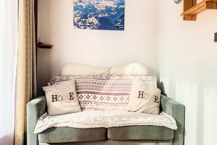 This charming studio, located in the “Améthyste” residence in the center of the village, is an ideal accommodation for up to 4 people. With a surface area of 21m², it features two separate sleeping areas: a mountain corner with two bunk beds and a living room with a convertible sofa. The apartment also includes a closed kitchenette equipped with an oven, 2 induction hobs, and a microwave, as well as a separate bathroom and WC. Enjoy the convenience of a west-facing balcony, perfect for unwinding after a day of exploring.