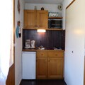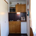 Inside the studio, you’ll find a kitchenette equipped with electric hotplates, a refrigerator, and an oven, perfect for preparing meals during your stay. The bathroom includes a shower, sink, and WC. The property also offers parking spaces and a ski locker for added convenience.