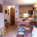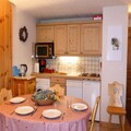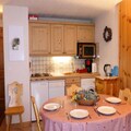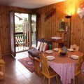 This cozy 2-room cabin apartment, located on the first floor, comfortably accommodates up to 5 people. It features a living room with a sofa bed, television, and dining area, along with a separate bedroom with a double bed and a cabin with bunk beds. The apartment offers a southern exposure, with a balcony to enjoy the views. Pets are not allowed, and the rental includes pillows, duvets, blankets, and dishes.