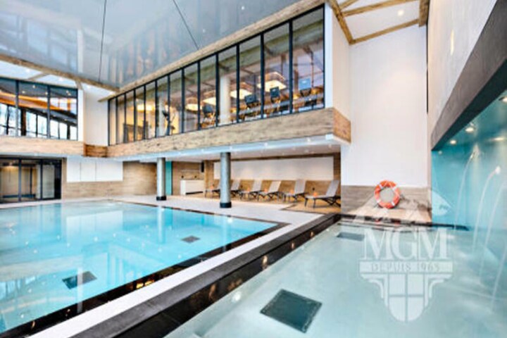 The residence offers a range of premium amenities designed to ensure your utmost relaxation. Unwind in the heated indoor pool or indulge in the fabulous spa, complete with a sauna, hammam, and whirlpools. Fitness enthusiasts can enjoy the well-equipped gym and cardio training facilities, while families will appreciate the dedicated children's area. Each apartment is thoughtfully designed, featuring a cozy living room with a sofa bed, a fully equipped kitchen, and comfortable bedrooms, including an en-suite double room. Step out onto your private balcony to take in the breathtaking alpine views.