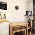 The kitchen is well-equipped with an oven, microwave, hob, toaster, kettle, coffee maker, dishwasher, raclette machine, and fondue set, perfect for preparing meals after a day of outdoor adventures. Additional amenities include a TV with a DVD player, a Bluetooth stereo, and cozy duvets for added comfort. A key box is available for easy access.