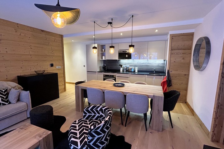 Modern 83 m² apartment accommodating up to 6 guests, located on the first floor with elevator access in the recent Blanc Mont-Blanc residence, right in the center of Chamonix yet in a quiet area.