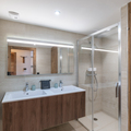Bathroom 1: Double hand basin, Shower, and Towel dryer