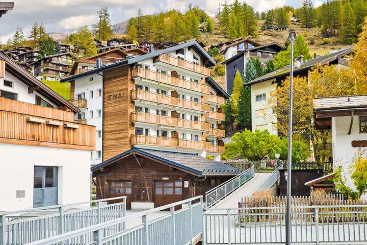Large apartment house "St. Pauli", 5 storeys. In the district of Spiss, in a quiet, sunny position, south facing position. In the house: lift, storage room for skis, central heating system. Shop 400 m, grocery 300 m, supermarket 500 m, restaurant 600 m, 8 minute walk to the centre, bus stop "Spiss" 50 m, railway station "Bahnhof Zermatt" 600 m, underground station "MetroSunnegga" 400 m. Mountain railway, ski lift, ski rental 400 m, ski bus stop 50 m, ice rink 600 m, children's playground 500 m. Please note: Additional accommodations can be booked. Property ref. 698.1 is situated on the same property.