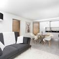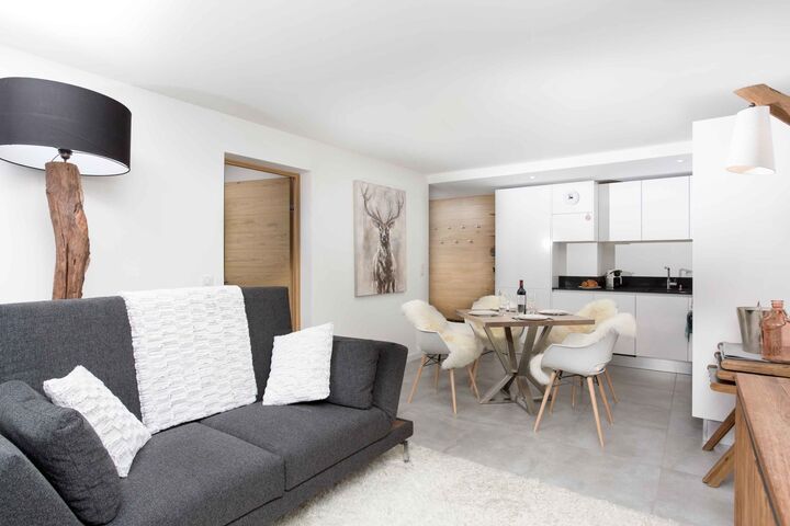 La Cordee 412 Apartment has an open living area, with a well-equipped modern kitchen. You'll find everything you need for a self-catered holiday including a microwave and real oven, a Nespresso coffee machine and a dishwasher. The dining table is full-sized for 4 people, so there'll be no knocking elbows. And the sitting area has a comfortable and stylish sofa, as well as opening out onto the balcony with table and seating for 2-4 people.