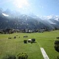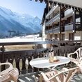 Sunny balcony with tables and chairs, Mont Blanc views