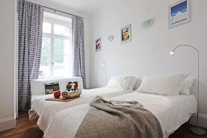 Alpine Museum apartment is a beautifully renovated Chamonix apartment on the first floor of the prestigious Residence Mont Blanc building overlooking the Place du Mont Blanc in the centre of Chamonix. It has two bedrooms, and two bathrooms, sleeping 4 people very comfortably. This Chamonix apartment boasts classical high ceilings, and is light spacious, with a large open plan living area overlooking the river and the town centre, with modern well equipped kitchen, lounge area and dining table and chairs for 4. The master bedroom has a king size bed, and ensuite bathroom with Italian shower. The 2nd bedroom of the Apline Museum apartment can be made as either a twin or a king bed, and has access to the 2nd bathroom with bath (shower). The Residence Mont Blanc is one of Chamonix's oldest buildings and is home to the Chamonix Alpine Museum too, right in the centre of Chamonix itself.