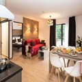 The apartment accommodates up to 4 guests, featuring a living room with a sofa bed, a well-equipped kitchen, a bedroom with a double bed, and a bathroom with separate toilet. Pets are welcome, and amenities like Wi-Fi, covered parking, and baby kits are included.