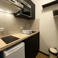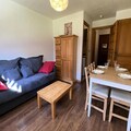 The studio features a well-equipped kitchen with a ceramic hob, microwave, refrigerator, coffee maker, and kettle. It includes a renovated shower room with a toilet. Additional amenities include Wi-Fi, a ski room, and services such as bed linens, towels, and end-of-stay cleaning (excluding kitchen and trash).