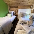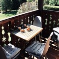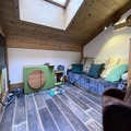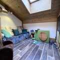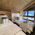 The apartment also includes a spacious bedroom with two single beds (90x190) on the upper level, along with a mezzanine relaxation area featuring a board game corner and retro gaming console. Additional amenities include a washing machine in the basement and a balcony with garden furniture offering beautiful views of Mont-Blanc.