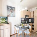 Additional amenities include a shower room with a toilet, a small balcony with a table and chairs, and private underground parking. The apartment also has a ski locker and WiFi access. Pets are allowed with a supplement, and the apartment is non-smoking, ensuring a comfortable and convenient stay.