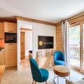Nestled in the heart of Chamonix, this elegant 40 m² apartment offers a comfortable retreat for up to six guests. The living room features a cozy sofa bed for two, complemented by a coffee table and semi-open kitchen, ideal for shared meals. Two well-appointed bedrooms include a double bed in one and two single beds in the other, perfect for families or small groups. The south-east facing balcony invites you to unwind with stunning mountain views, enhancing your stay with a touch of serenity.