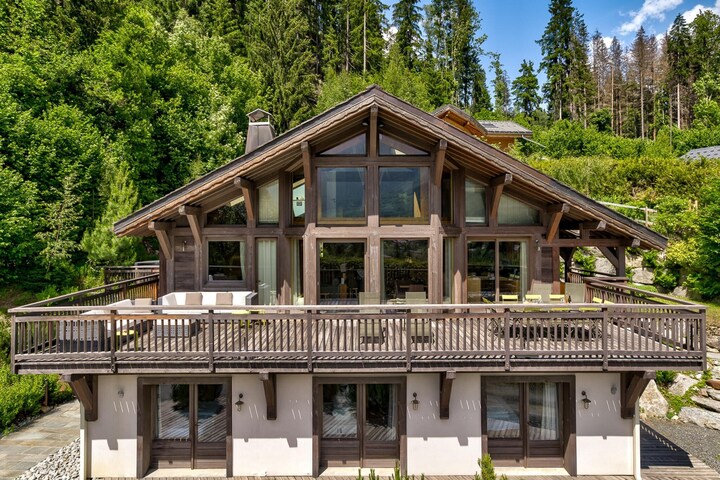 Chalet le Favre is an exclusive and sophisticated high-end property, beautifully situated on the sunny side of the valley in a peaceful residential area near Chamonix. This exceptional chalet offers a luxurious yet supremely comfortable base for your holiday, boasting truly fabulous, unbeatable panoramic views of the magnificent Mont Blanc Massif. The spacious chalet sleeps up to 12 guests across six well-appointed bedrooms, complemented by five bathrooms. No expense has been spared on quality fixtures and furnishings, creating a superior 'home away from home' experience, ensuring comfort and elegance for the most discerning traveller. For relaxation and entertainment, the property excels. Step out onto the spacious wrap-around terrace, which enjoys all-day sun, to find the outdoor hot tub—the perfect spot to unwind while soaking in the spectacular alpine scenery. For cosy evenings, the interior features an open log fireplace, alongside excellent entertainment facilities including Free WiFi, UK TV, a DVD player, and a music system. The fully equipped kitchen provides everything needed for self-catering, including a Nespresso machine, as well as traditional fondue and raclette sets for authentic mountain dining experiences.The chalet is perfectly geared for both winter and summer adventurers. It features a practical, dedicated ski room with boot dryers, ensuring warm and dry footwear for mornings on the slopes. For ease of access, exterior off-road parking is provided for up to four cars, and having a car is recommended for exploring the wider Chamonix area and nearby attractions like Annecy or Courmayeur.
