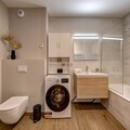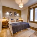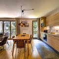Accommodating up to six guests, the apartment features three bedrooms and two bathrooms. The master bedroom has an ensuite shower and WC, while the remaining bedrooms share a bathroom and separate WC. The third bedroom offers flexibility with either twin or double configuration, making the apartment suitable for families, couples, or groups. Entertainment options include free WiFi, streaming services such as Netflix, and a music speaker. Additional amenities include a washing machine, ski and bike storage, and boot dryers, ensuring guests have everything they need for both winter and summer stays.