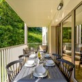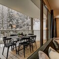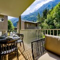 This contemporary three-bedroom alpine apartment offers stylish interiors and an excellent location just a short walk from Chamonix town centre. The open-plan living area is bright and spacious, with large windows allowing plenty of natural light and showcasing stunning mountain views. A generous covered balcony extends the living space, featuring outdoor dining furniture — perfect for enjoying meals while taking in the alpine scenery. The fully equipped kitchen includes a full-size oven, microwave, fridge, freezer, dishwasher, Nespresso coffee machine, and all essential utensils, ideal for comfortable self-catering stays.