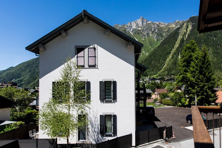 Just five minutes from Chamonix’s vibrant main street, this spacious duplex apartment blends alpine charm with mid-century elegance. Once part of a traditional Chamonix building, it has been beautifully redeveloped into a calm, light-filled retreat perfect for families or friends. The open-plan living space opens onto a private south-facing terrace, where you can dine outdoors or simply take in panoramic views of Mont Blanc. Its peaceful residential location means you can relax in quiet comfort while still being close to cafés, boutiques, and the Aiguille du Midi cable car.