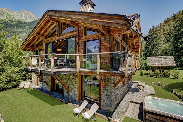 The chalet in Chamonix-Mont-Blanc has 5 bedrooms and capacity for 10 persons. Accommodation of 326 m² tastefully-furnished and is spacious, It has mountain and garden. The property is located 0 m metro station, 1 m ski resort "La Flegere", 4 m ski resort "Savoy Nursery Slopes", 4 m ski resort "Le Brevent", 4 m ski resort "Grands Montets", 5 m ski resort "Planards Nursery Slopes", 8 m ski resort "Le Tour & Vallorcine", 13 m ski resort "Les Houches", 104 m international airport "Geneva", 450 m bus station "Les Bois bus stop", 650 m river "Arve", 800 m the restaurant "La Cabane des Praz", 800 m golf course "Chamonix les Praz 18 hole golf course", 950 m the restaurant "Le Castel", 950 m train station "Chamonix les Praz", 3 km the restaurant "Albert Premier", 3 km city "Chamonix", 5 km supermarket "Carrefour", 5 km bus station "Chamonix Sud Bus Station", 6 km hospital "Hospital Mont-Blanc", 104 km airport "Geneva" and it is located in a a quiet zone and in a mountainous area. The accommodation is equipped with the following items: elevator, garden, outdoor furniture, terrace, washing machine, dryer, barbecue, fireplace, iron, internet (Wi-Fi), hair dryer, balcony, squash court, gym / fitness centre, alarm, sauna, hot tub, central heating, heated swimming pool private, garage and parking in the same building, 6 TVs, satellite tv (Languages: English, French). The open plan kitchen, of induction, is equipped with refrigerator, microwave, oven, freezer, dishwasher, dishes/cutlery, kitchen utensils, coffee machine, toaster and kettle.