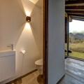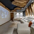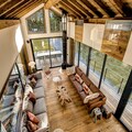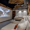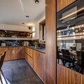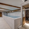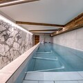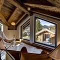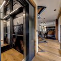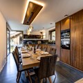 The interior features a bright and spacious living area with a fireplace, large windows, and access to a private garden and terrace. The fully equipped induction kitchen includes modern appliances such as an oven, microwave, refrigerator, freezer, dishwasher, coffee machine, toaster, and kettle — ideal for both casual meals and group dining. Guests can unwind in total luxury with a private sauna, hot tub, and a heated swimming pool, or relax indoors with multiple TVs, Wi-Fi, and stylish lounge areas. The chalet also includes a lift for convenience and air conditioning in the living area for added comfort.