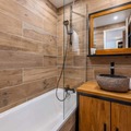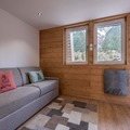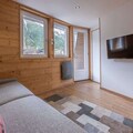 Inside the room, you’ll find a layout built for comfort: a welcoming living room with space to gather and plan the day or relax after ski runs or hikes, furnished with a double bed, connected to the well-equipped kitchen with a dishwasher. The bedroom comes with a bed option to choose from – a double bed or two single beds, and a shared bathroom. Additional comforts like heating, a TV, Wi-Fi, and a washing machine are offered to alleviate your experience.