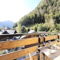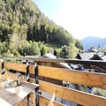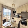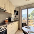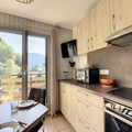 The well-equipped kitchen includes a microwave, oven, 3-burner induction hob, filter coffee maker, toaster, kettle, and a single sink. A dining area with a table and four chairs is available, while the living area is complete with a two-seater sofa, armchair, and a television. The south-facing balcony provides a beautiful mountain view, with a table and chairs perfect for outdoor relaxation. The property also features a parking space and ski room for added convenience