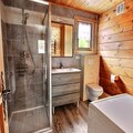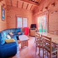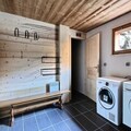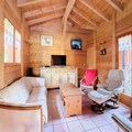 The chalets are equipped with fully functional kitchens, including a Dolce Gusto coffee maker, raclette and fondue machines, and a washing machine. The bathrooms are equipped with showers, sinks, and towel dryers, and each chalet has a terrace with garden furniture and a barbecue. Additional features include a laundry room with a dryer, a play area with a swing and slide, and a family room with beds on the mezzanine.
