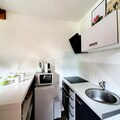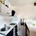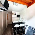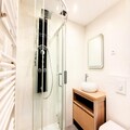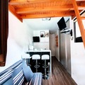The apartment includes a fully equipped kitchen with an induction hob, refrigerator, freezer, oven, microwave, and a coffee machine. A raclette and fondue machine are also available for guests. The bathroom features a spa shower, towel dryer, sink, and toilet. The bright living room is furnished with a TV and a dining table with 4 stools.