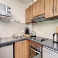 Inside, the apartment features a fully equipped kitchen with induction hob, oven, microwave, dishwasher, and Nespresso coffee machine. A dining area with a wooden table and a living room with a smart TV and DVD player provide ample space for relaxation. The bathroom includes a bathtub, sink, toilet, and towel dryer. For outdoor enjoyment, a terrace with a table, chairs, and a barbecue is available during the summer months.