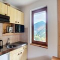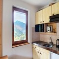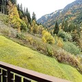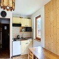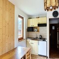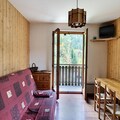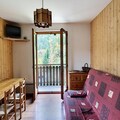 The studio is equipped with a kitchenette featuring an oven/microwave, filter coffee maker, fridge, and electric hotplates, along with a dining area for meals. A recently renovated bathroom includes a shower, sink, towel dryer, and window. The living area provides a TV and access to a balcony with a forest view. Additional amenities include a raclette machine for 4 people, making it a cozy and convenient choice for your stay in the Alps.
