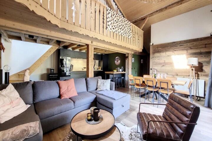 This spacious chalet is ideal for large groups, accommodating up to 12 people across two floors. The chalet features six comfortable bedrooms, including two master suites with en-suite showers, and a mezzanine with four single beds. It also includes a convertible sofa in the living room, ensuring ample sleeping space. Pets are allowed (except for category 1 and 2 dogs), making it a great choice for families with pets. Duvets and pillows are provided for all beds, but bed linen and towels are not, so guests should bring their own.