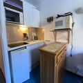 The studio, located on the 3rd floor (no elevator), includes an entrance with a mountain corner, a living room with a convertible sofa and television, a west-facing balcony, a kitchenette (small refrigerator, 4-burner ceramic hobs, microwave, mini-oven, electric coffee maker, crockery, kitchenware), a bathroom, and a toilet. Bedding (mattress pads, duvets, and pillows) is provided. There is no internet access. A €300 deposit is required.
