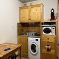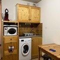 The apartment features a fully equipped kitchen area with a ceramic hob, microwave, refrigerator, washing machine, SENSEO pod coffee maker, electric kettle, fondue and raclette machine, and kitchen utensils. The bathroom is equipped with a bathtub and separate toilet. A ski locker is available to safely store your equipment, and additional amenities include a vacuum cleaner and drying rack.