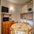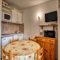 The apartment includes a bathroom with a bathtub and a separate toilet. The kitchen area is equipped with a TOP refrigerator, ceramic hobs, a mini oven, microwave, coffee maker, raclette grill, and kitchen utensils. A north-facing balcony offers stunning views of the mountains, perfect for relaxing after a day on the slopes.